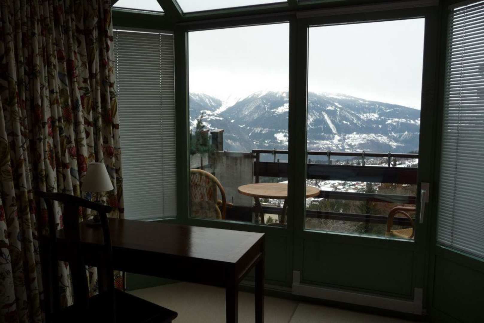 Schreibtisch mit Blick auf die Walliser Berge