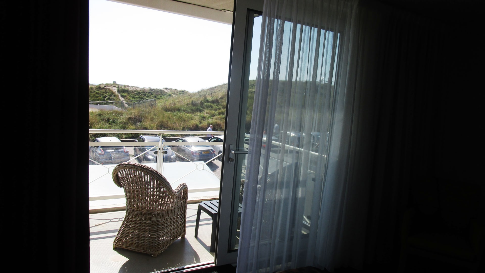 Großer Balkon mit Blick auf den Leuchtturm, die Dünen und die Nordsee.