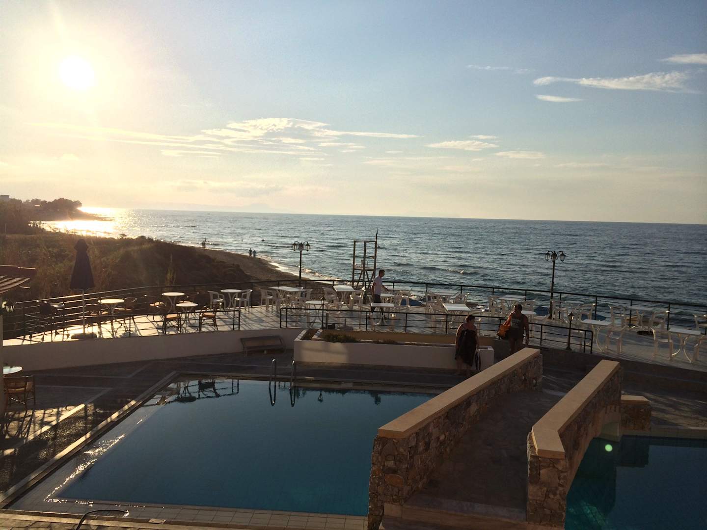 Ausblick vom Zimmer mit Meerblick auf Pool und Meer