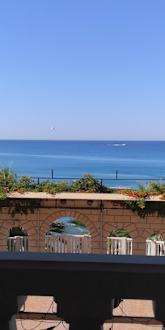 AusblickAusblick zum Meer von der Terrasse auf der gegessen wird. Essen mit Meerblick... Unglaublich