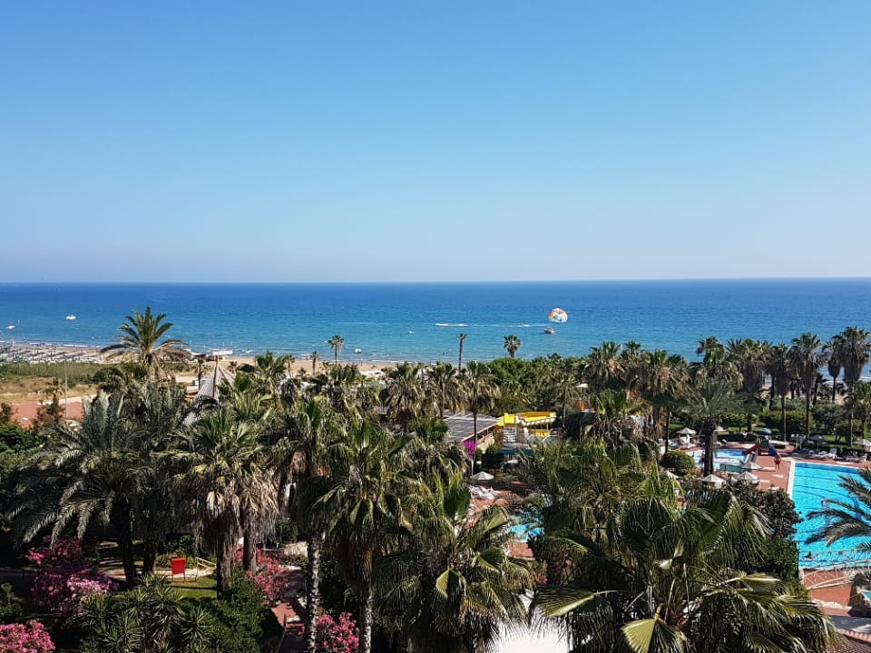 Blick zum Meer über den Pool und Garten