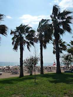 Blick vom Hotelgarten auf den Strand