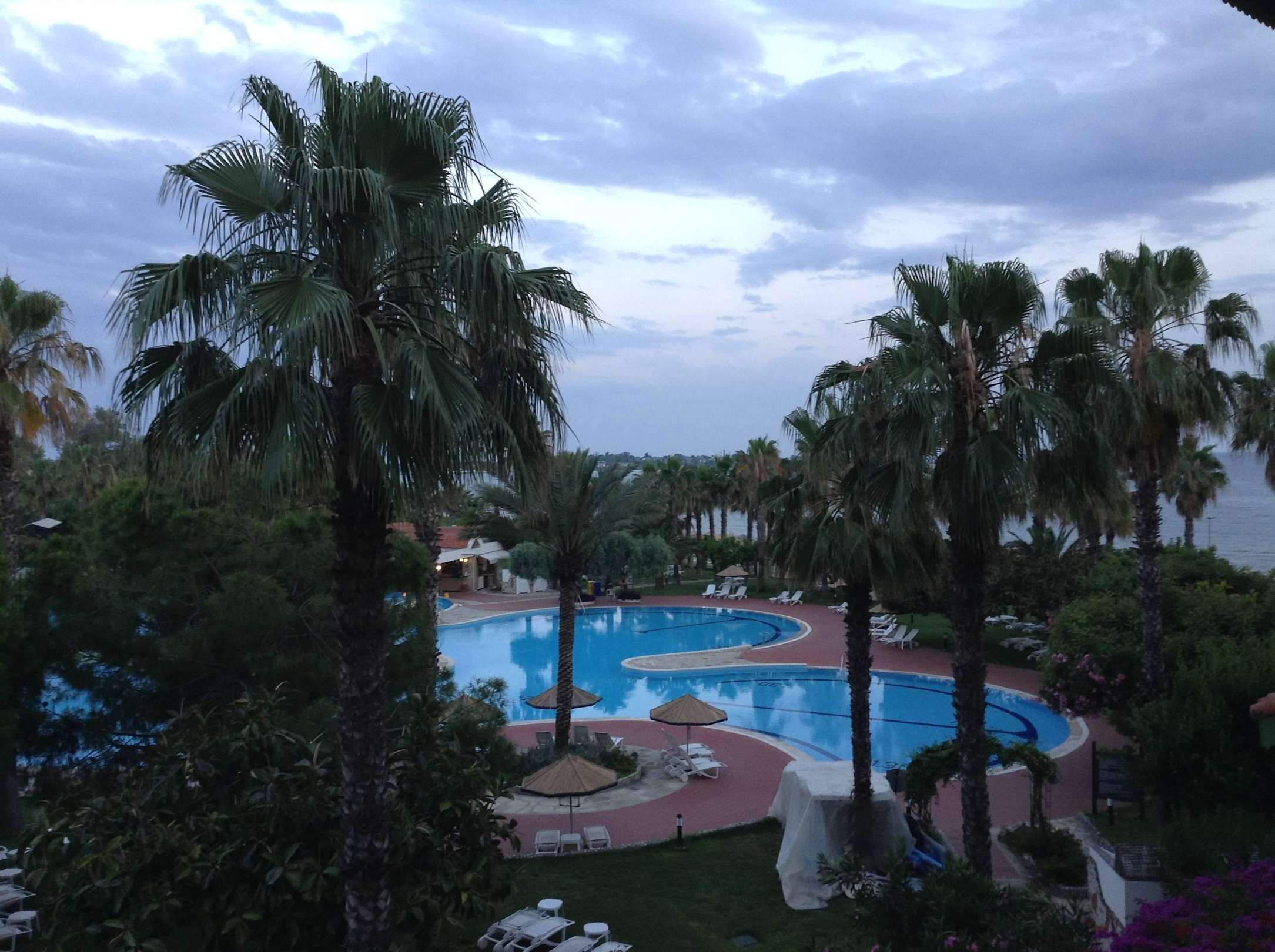 Abendlicher Blick vom Zimmer zum Garten und Meer