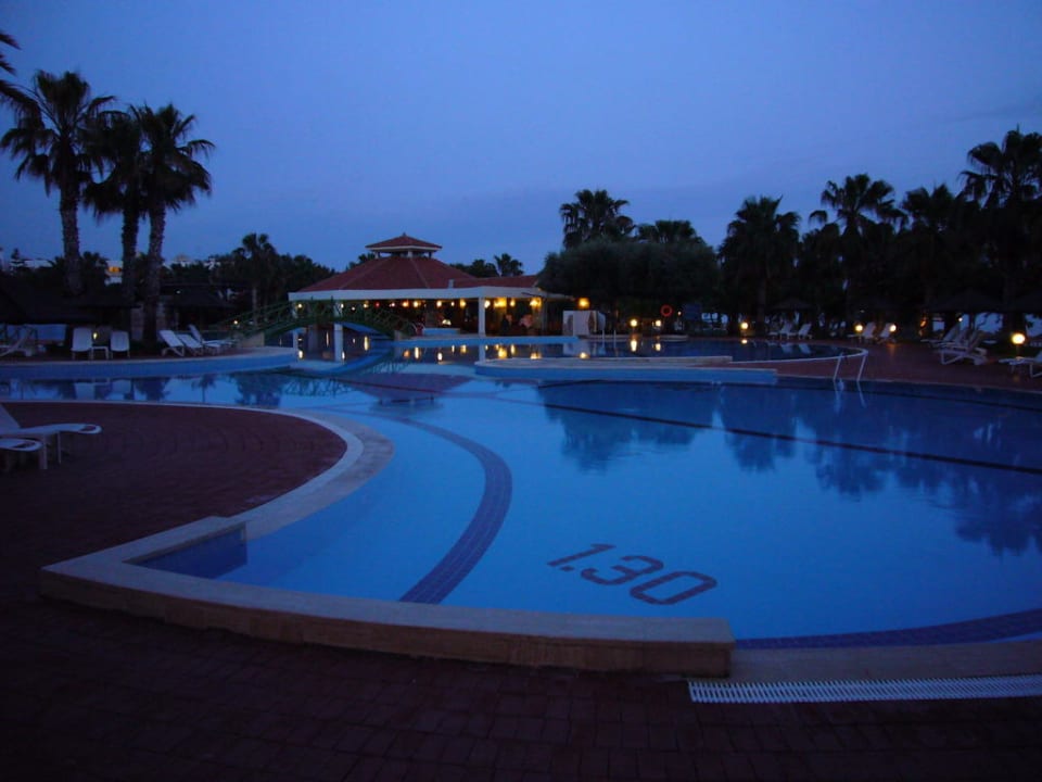 Poolanlage abends mit Beleuchtung