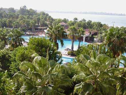 Viel natürlicher Schatten.Blick von Haus Perge auf die wunderschöne Poollandschaft mit gaaanz vielen Palmen...