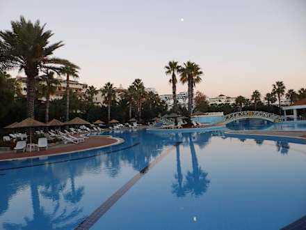 Blick auf den Pool im Defne Star mit Brücke rechts Poolbar und Liegeflächen