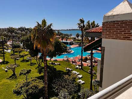 Blick über Pool zum Meer