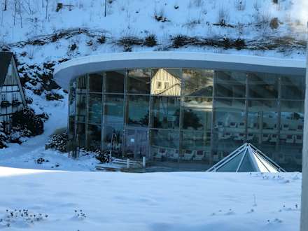 Blick von unserem Balkon auf den Schwimmbadbereich mit den Panoramafenstern