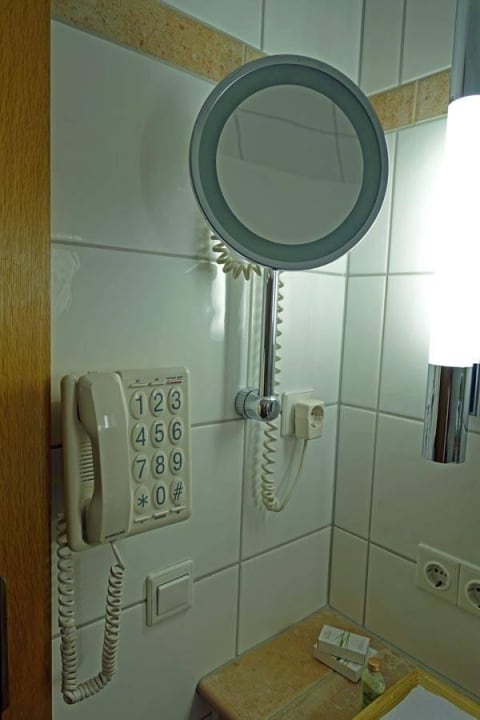 Großer Rasierspiegel und Telefon im Bad