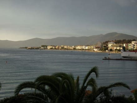 Blick vom Balkon über den Hafen und Ort, hinten links (an der Landzunge) liegt das Fischlokal