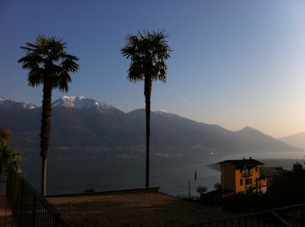 Blick durch zwei Palmen über den Lago Maggiore zum Monte Lema