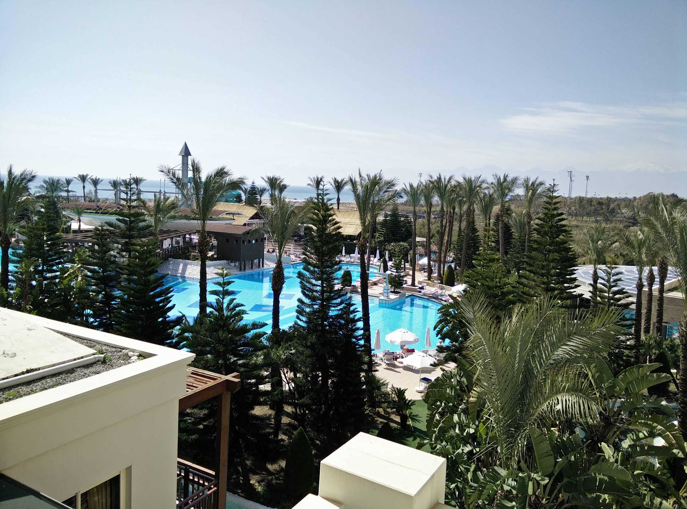 Blick vom Balkon auf den Pool-Bereich