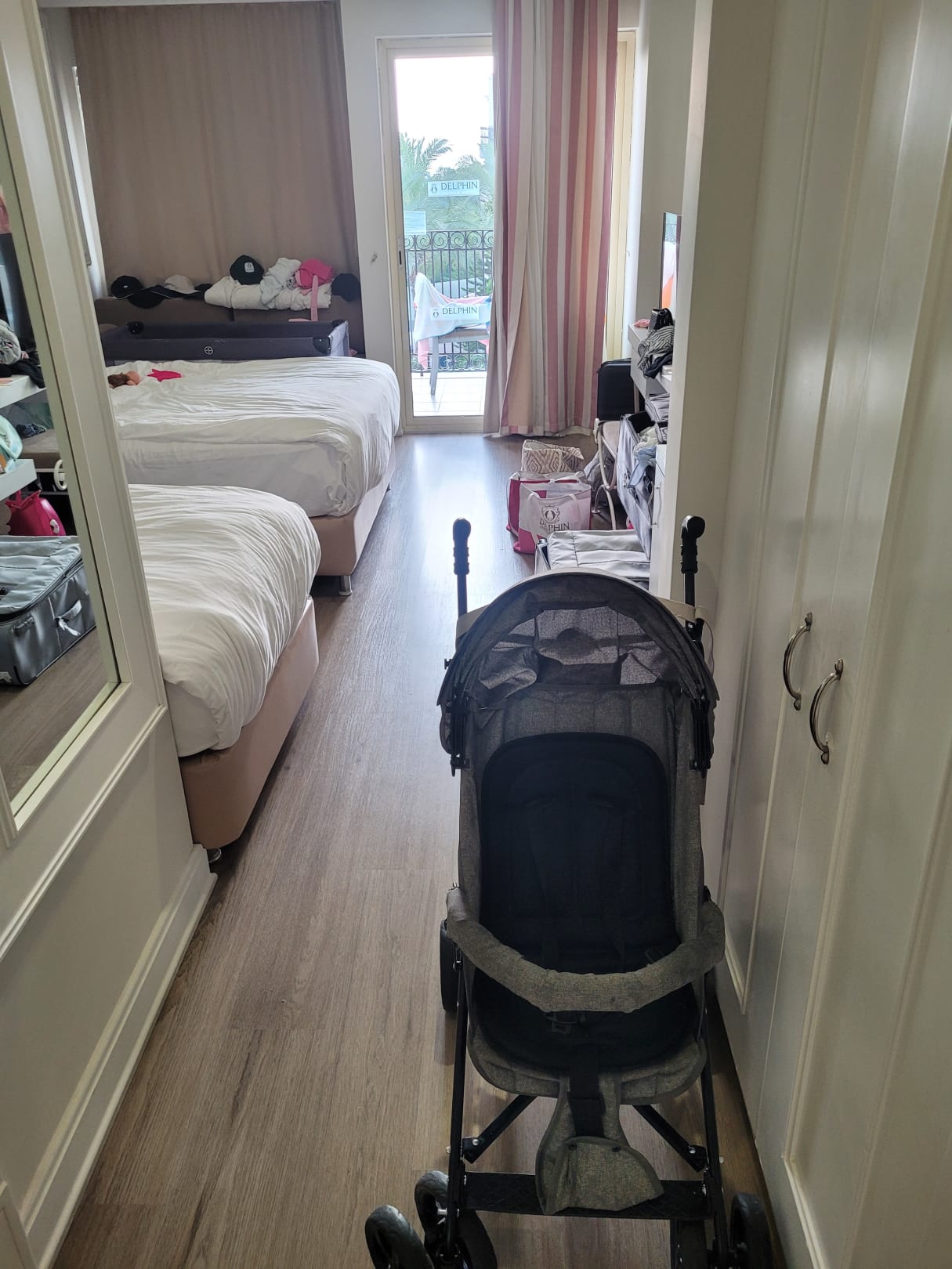 Zimmer leider sehr klein mit Babybett (zwischen Sofa in der Ecke links oben und Doppelbett) und Kinderwagen und den Koffern TV vorhanden, Minibar, Wasserkocher...