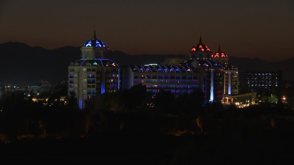 Blick aus dem Zimmer zum Nachbarhotel am Abend