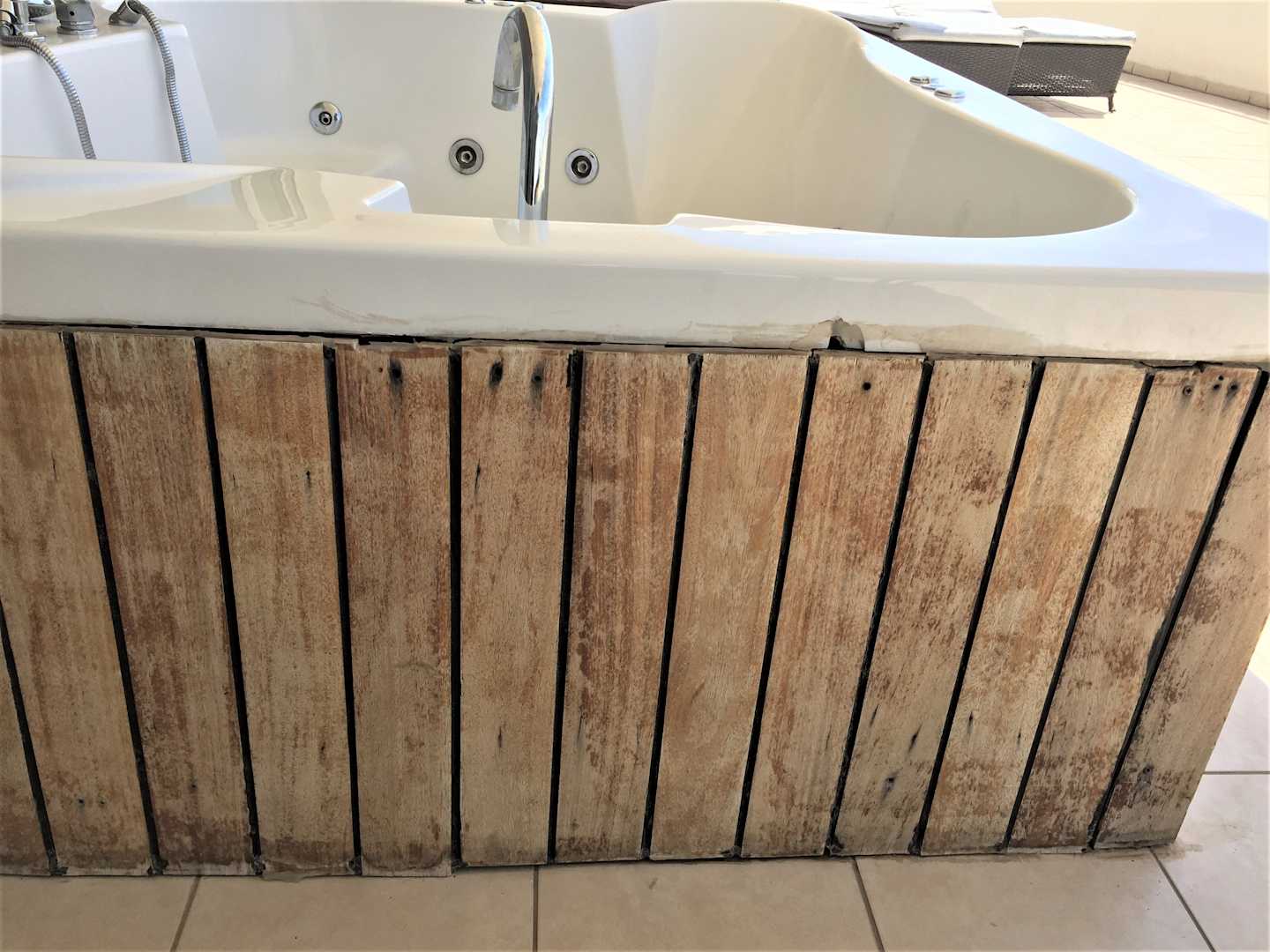Verwitterter, dreckiger und kaputter Jacuzzi. Hier geht niemand gern baden.