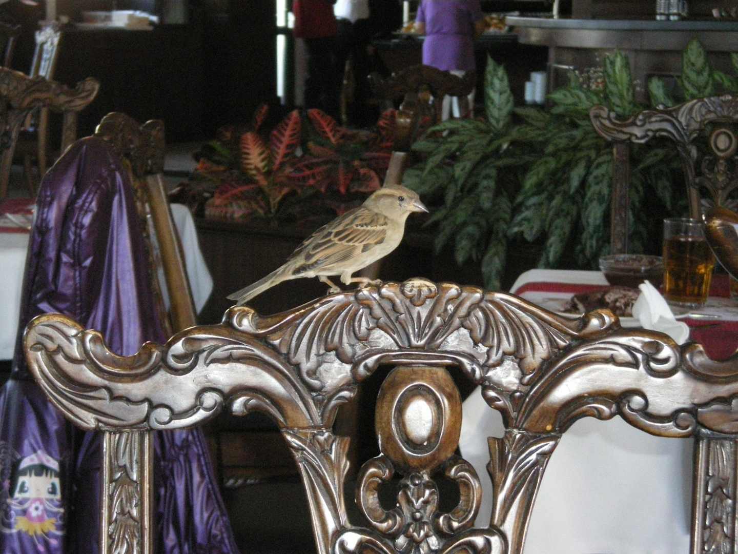 Frecher Spatz im Restaurant