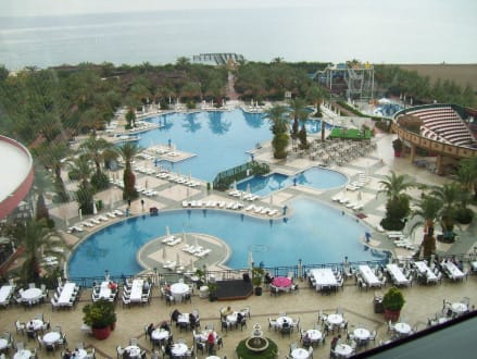 Blick auf Poolanlage und Meer