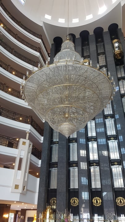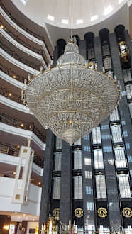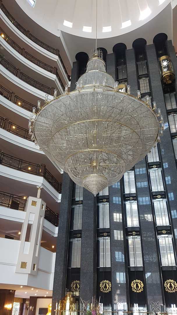 Kronenleuchter im Zentrum der Lobby mit Liftanlage im Hintergrund