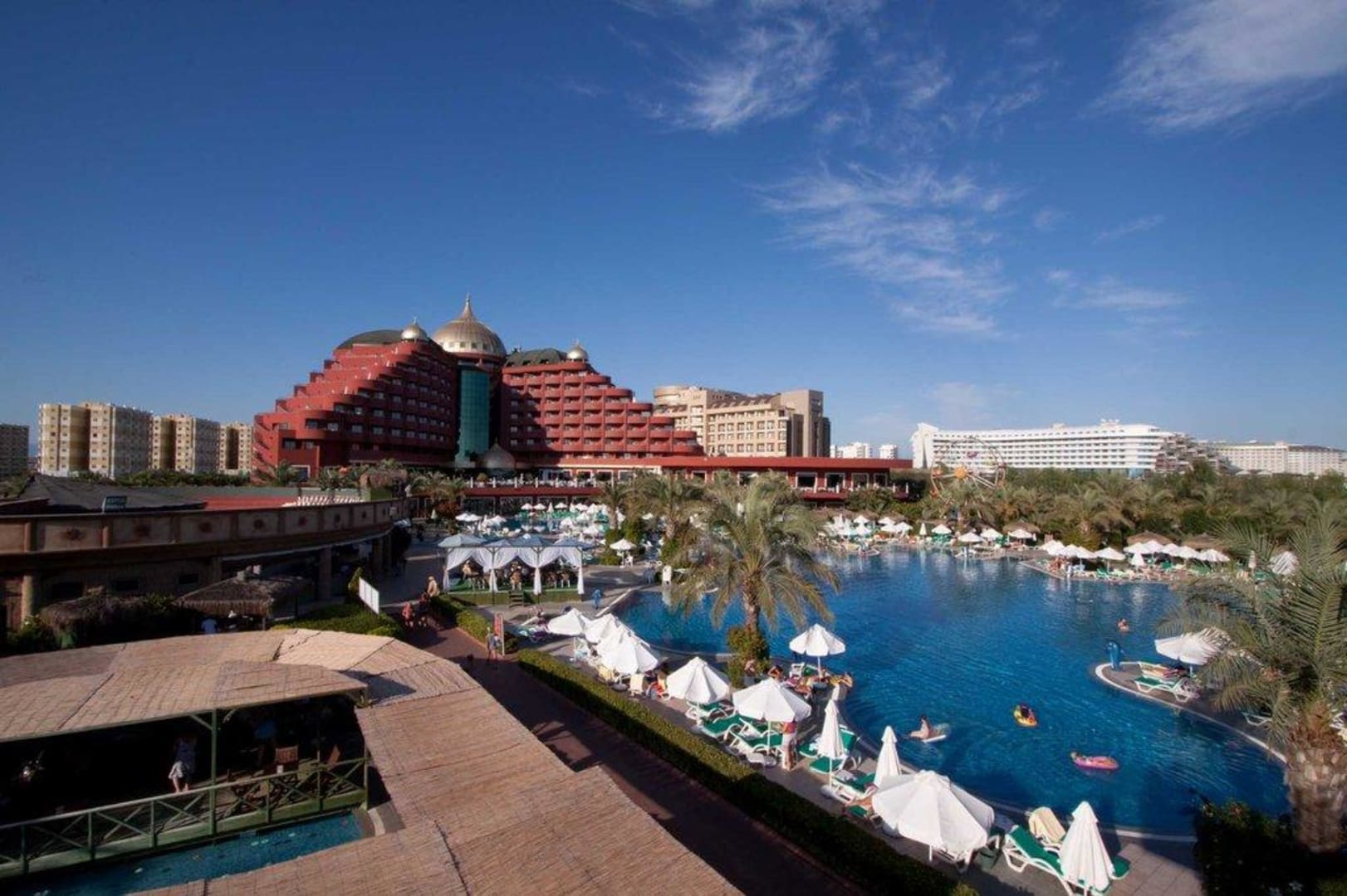 Blick vom Rutschenturmeine schöne Ansicht, rechts der Außenpool, direkt vorne die Kaffeebar (unter Strohdach), dahinter die Arena, hinten der Palast