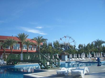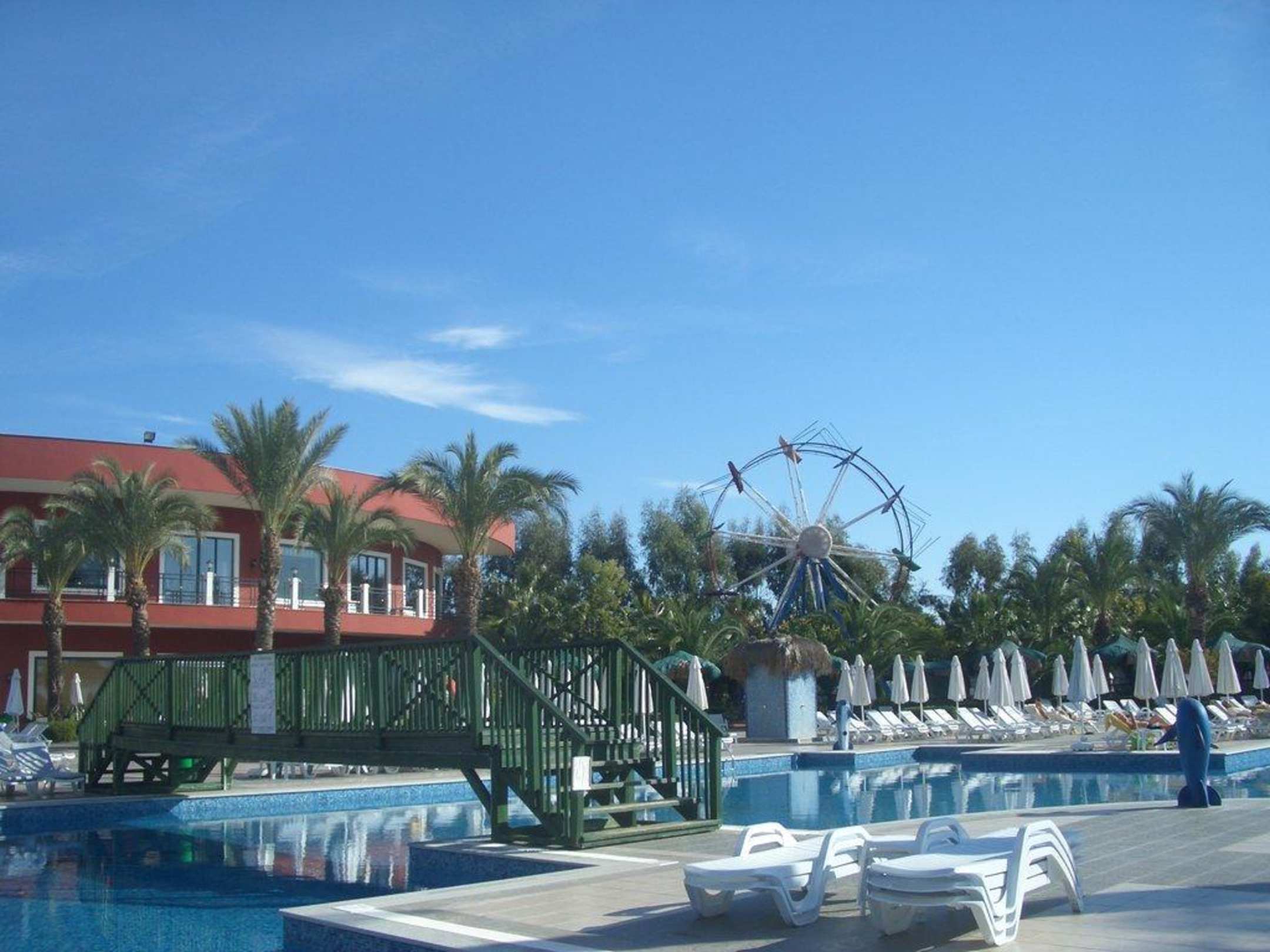 die Hotelanlage mit Liegestühle und im Hintergrund das Riesenrad