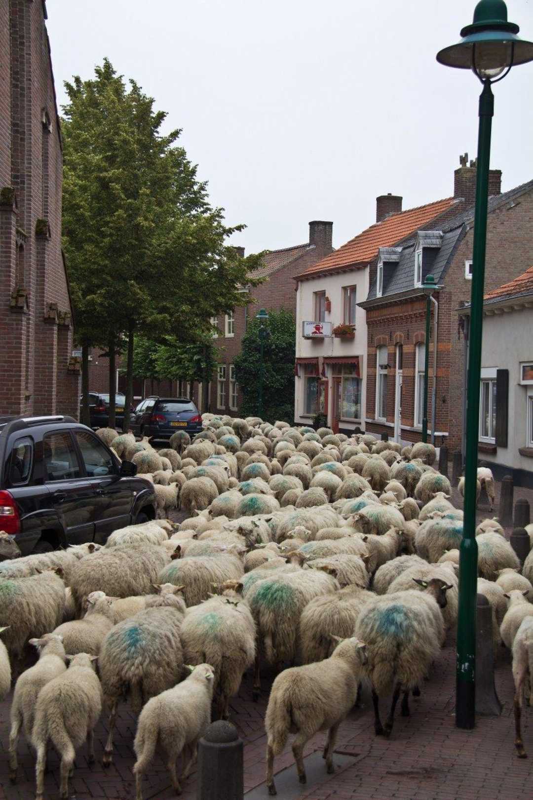 Schapenkudde door het dorp