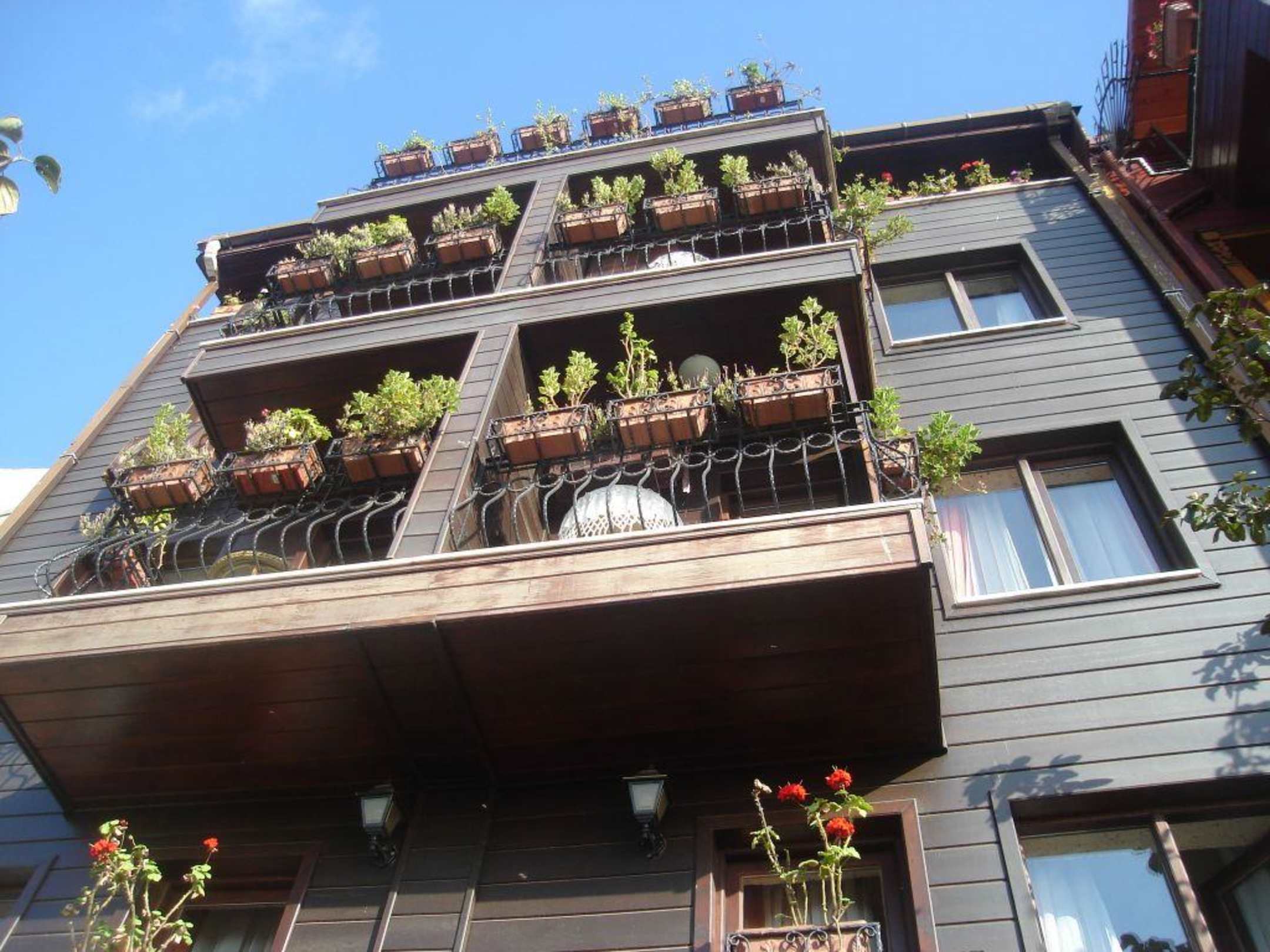 Ein Blick nach oben von unserer Terasse auf die Balkone über uns.