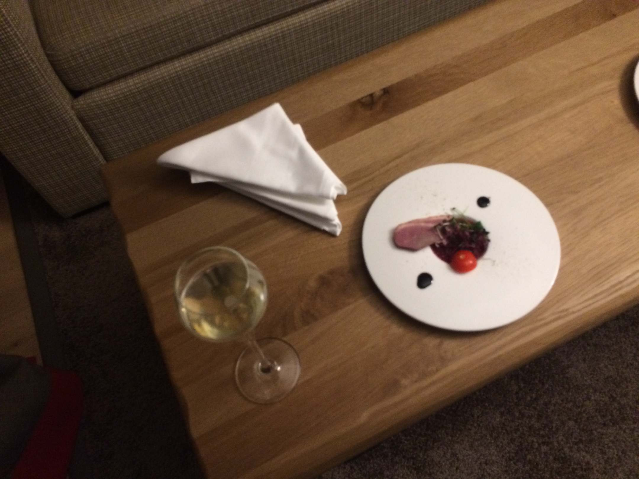 Der Gruss aus der Küche: Entenbrust mit Preiselbeerglace. Dazu gab es noch einen Brotkorb mit gesalzener Butter und einem Kürbiskernaufstrich.