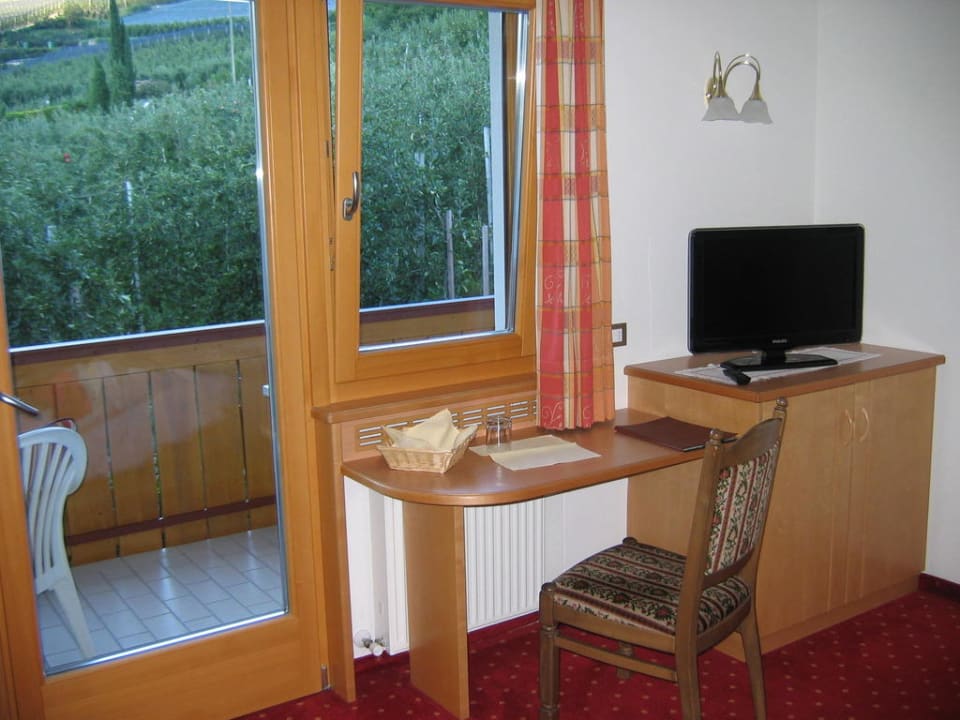 Schreibtisch mit Flachbildschirm und Schrank