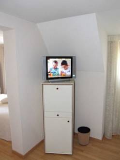 Fernsehecke im EinzelzimmerDas Bild wurde vom Chaiselong aus aufgenommen. Links geht es zum Schlafbereich und Badezimmer.