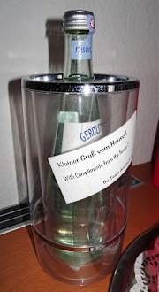Gruß vom Haus mit einer Flasche Mineralwasser