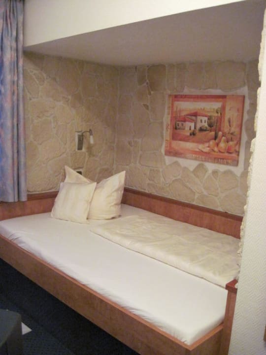 Wandbett unterm DachDas Bett ist in der 3. Etage etwas anders positioniert und in die Wand eingepaßt. Vom Bett kann man gut TV sehen.