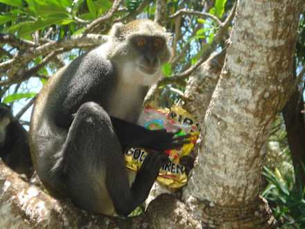 HARIBO macht Kinder froh und Meerkatzen eben soJa wenn man seine Sachen nicht gut weg packt, klauen die Affen alles was essbar ist.