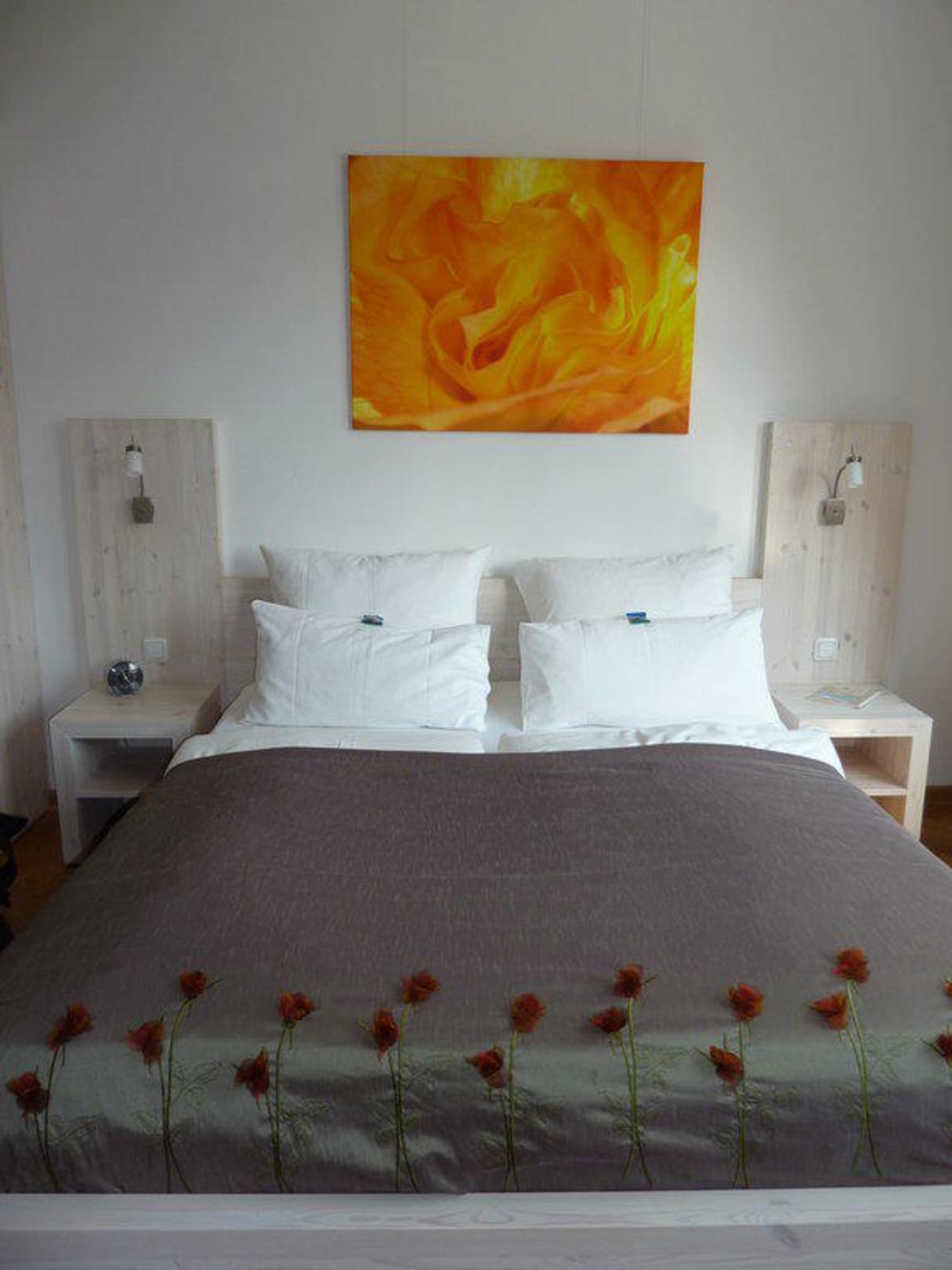 romantisch die schöne Tagesdecke mit den Röschen, ein Wecker steht ebenso am Bett