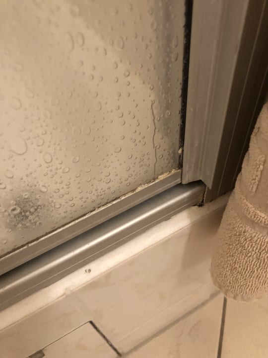 Dreckige und verkalkte Duschtür.