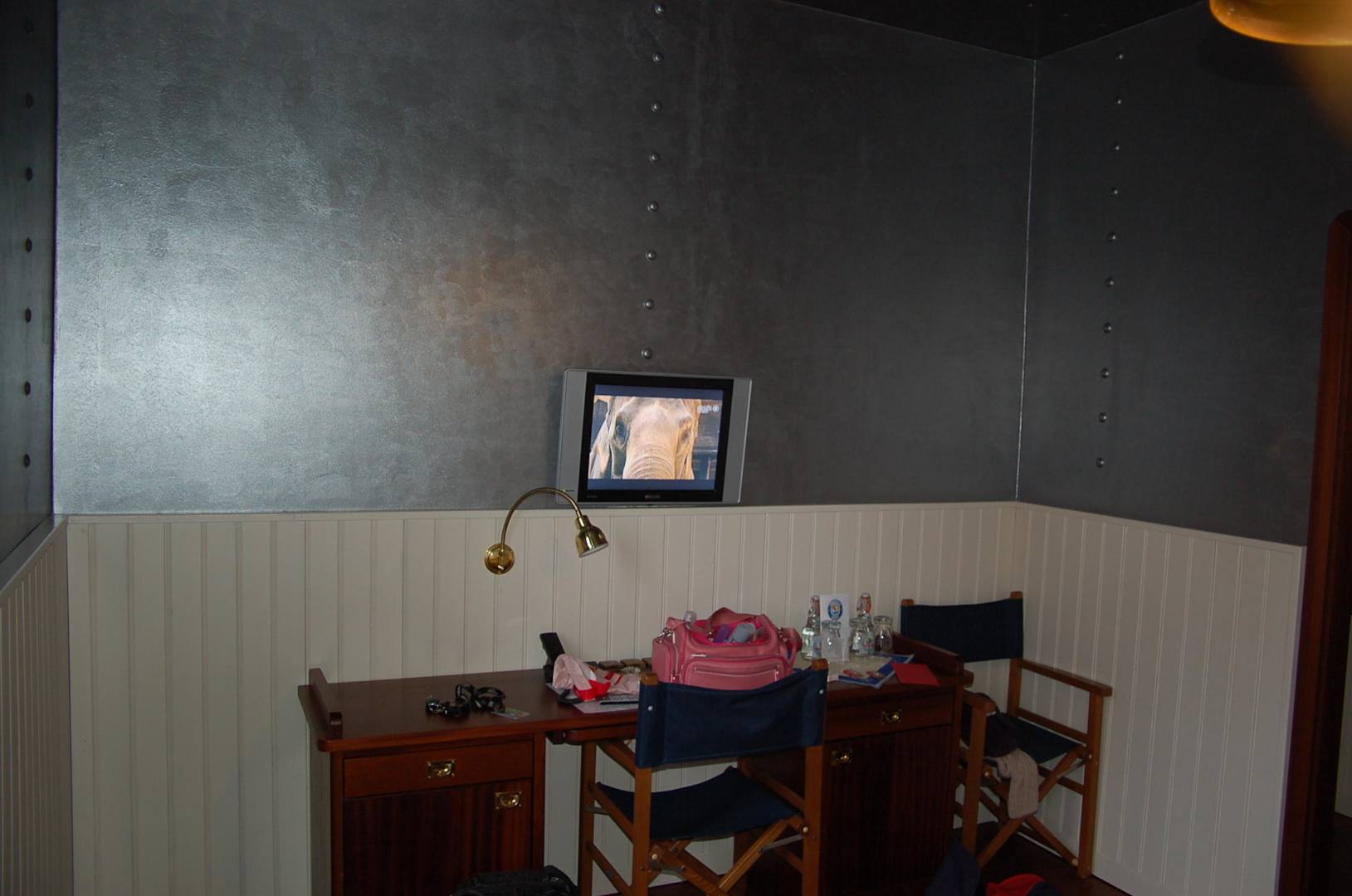 Der Schreibtisch und der kleine Fernseher fotografiert vom Bett.