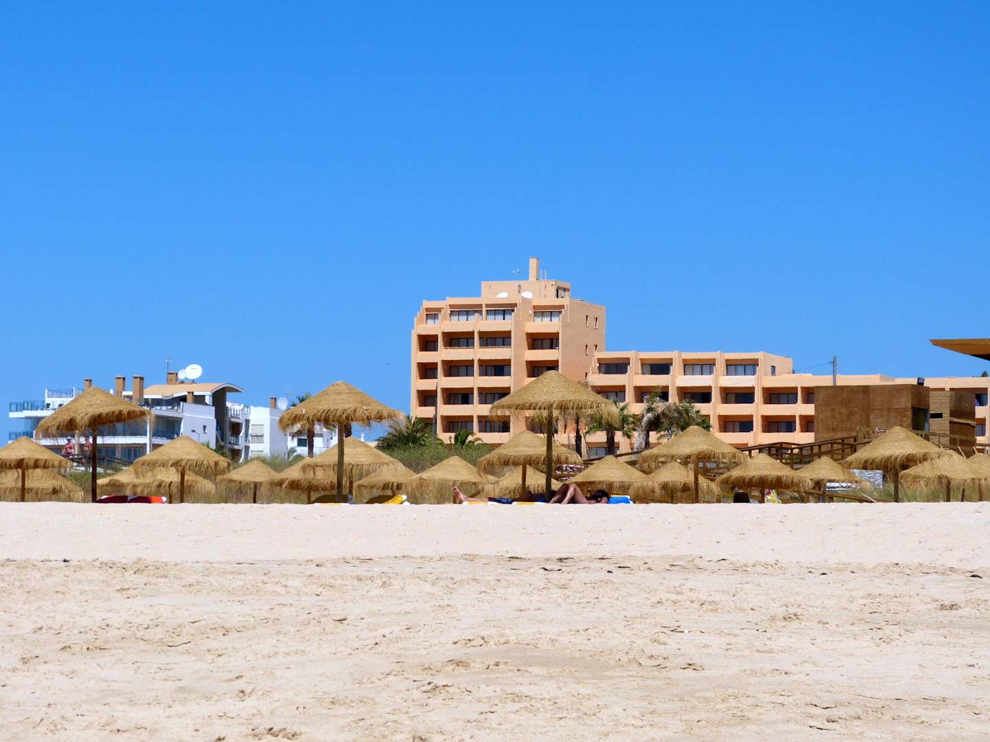 Blick vom schönen Sandstrand aufs Hotel