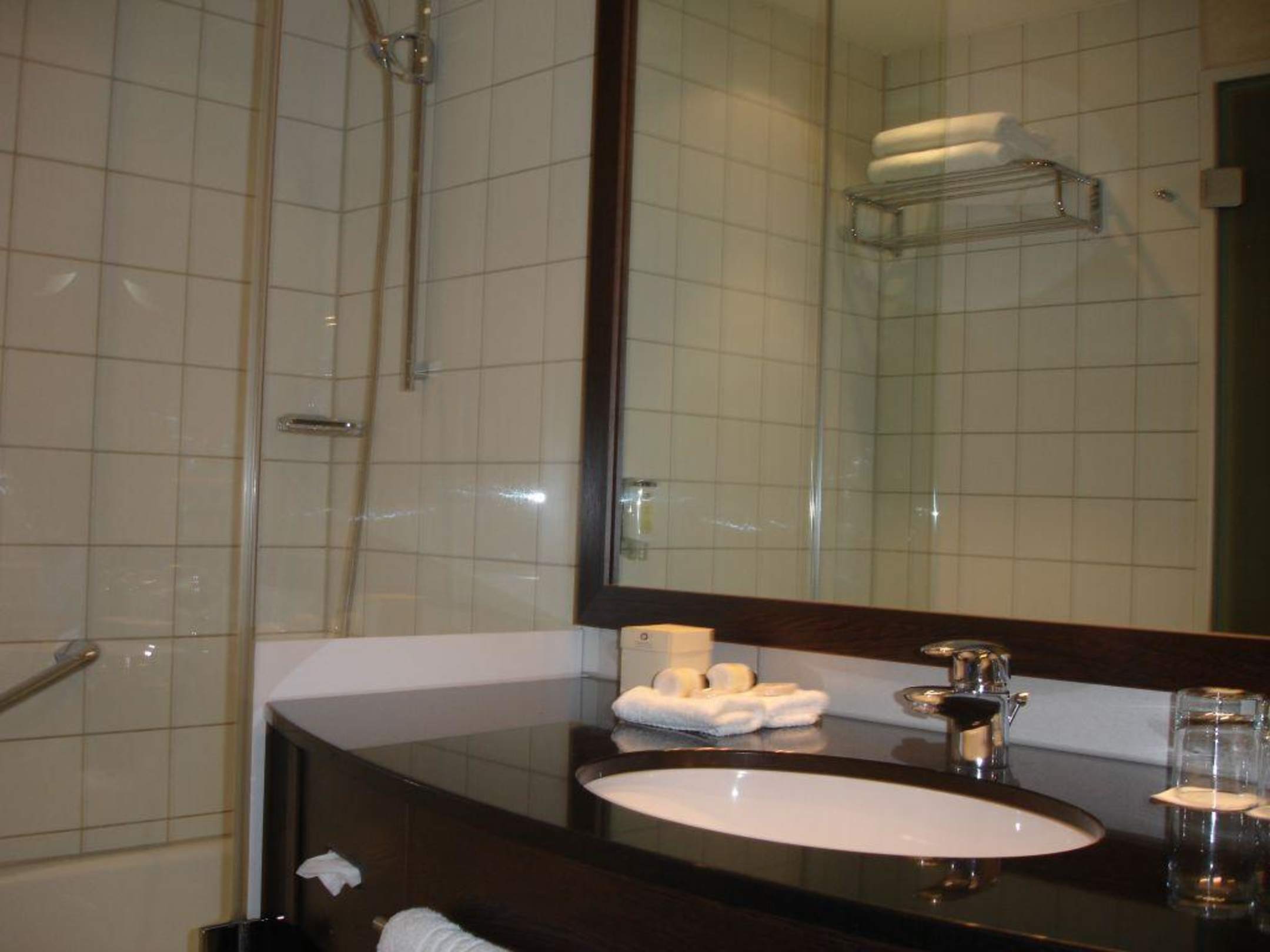 mit ausreichend Handtüchern und Pflegemittelchen (u.a. auch Q-Tipp, Watte-Pads, Nagelpfeile..). An der Wanne befindet sich eine bewegliche Glas-Wand, so dass man die Wanne zur Dusche umfunktionieren kann.