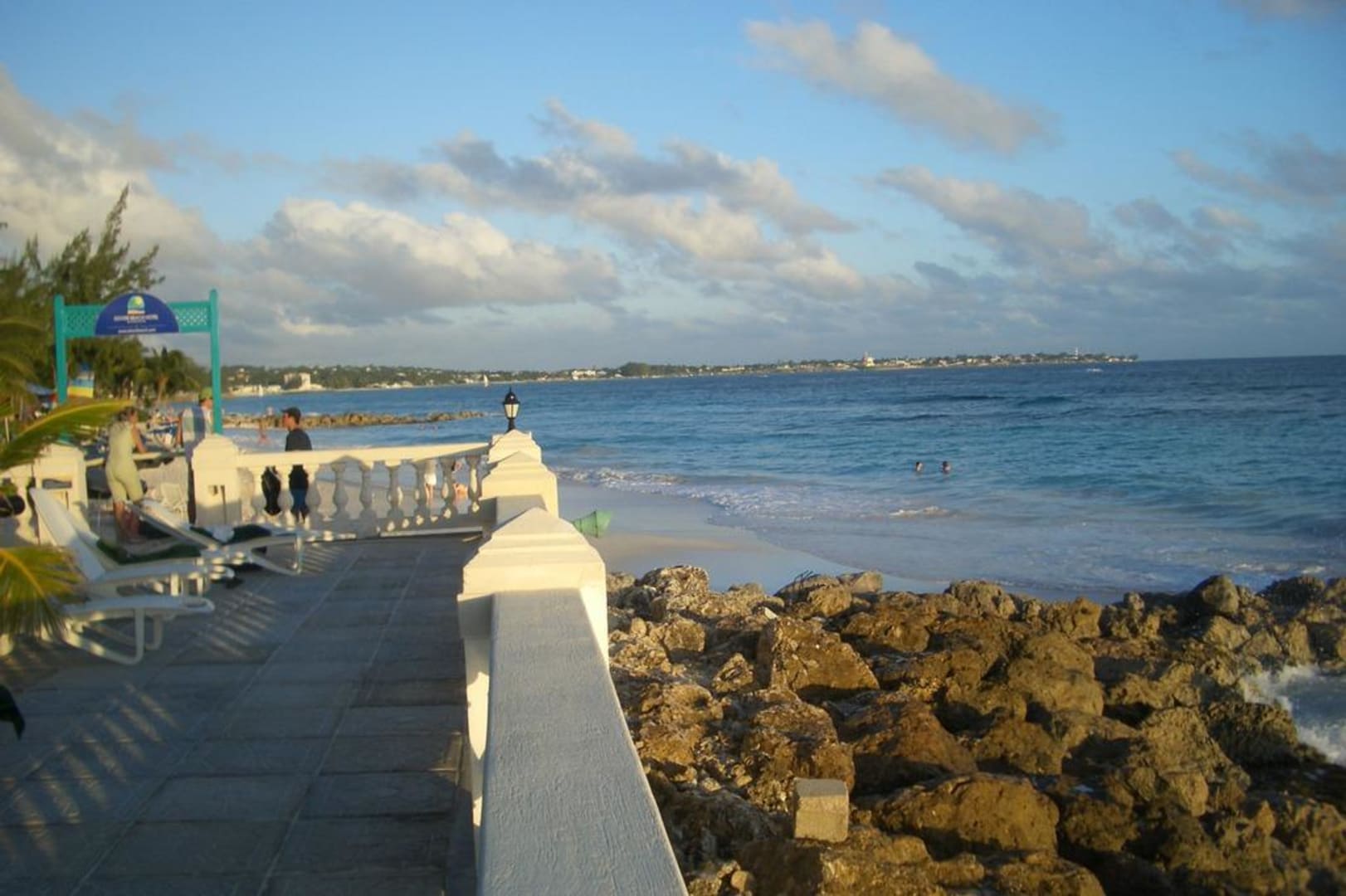 Blick vom Sundeck nach links, wo man über ein paar Stufen direkt zum Strand kommt.