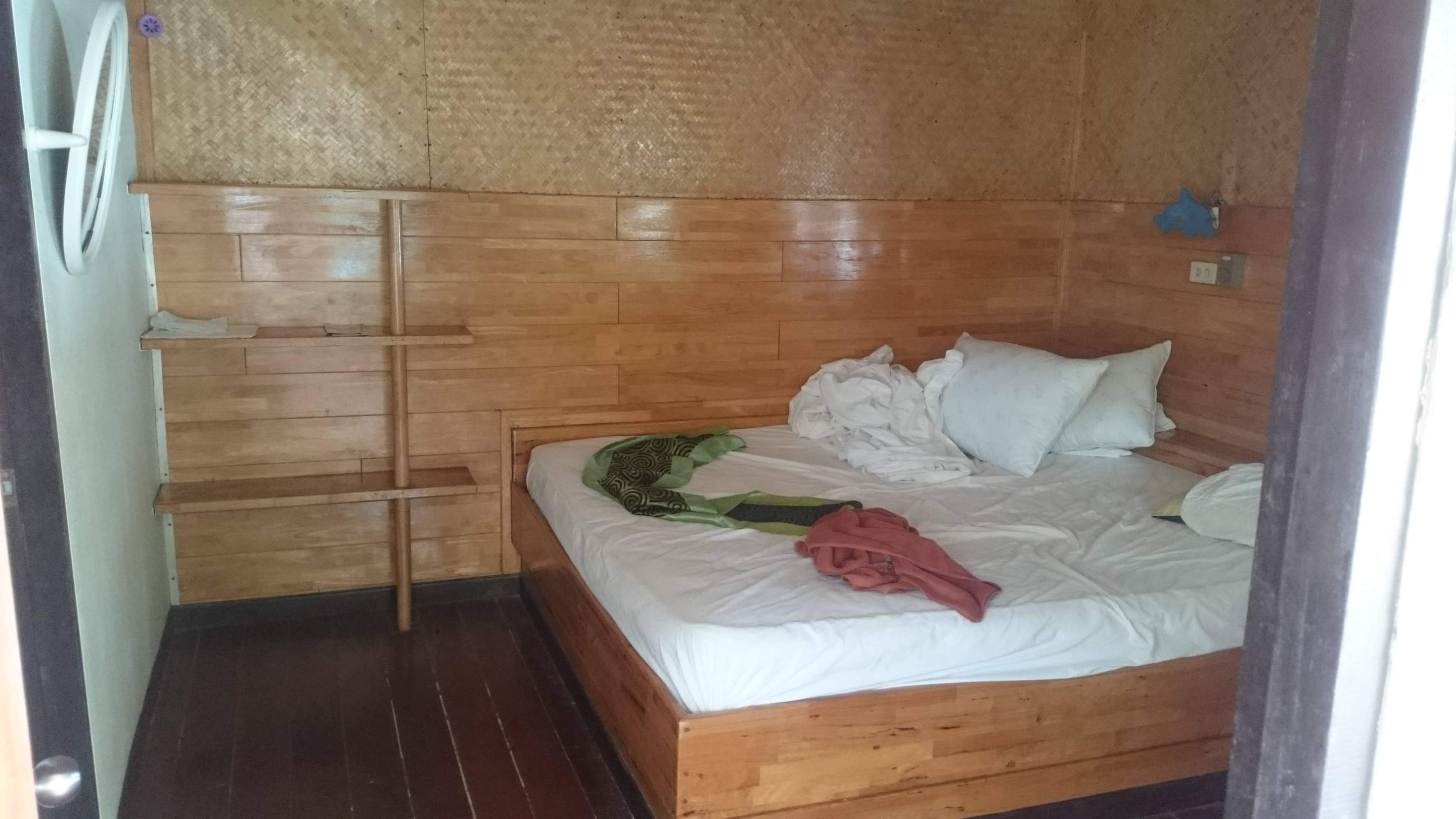 Einfache Zimmer mit Bett, Regal und Klimaanlage.