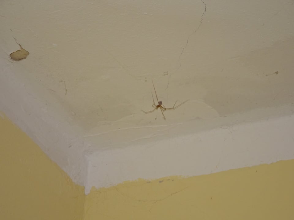 ZimmerDecke mit großer Spinne, in den anderen Ecken an der Decke aber auch am Boden überall Spinnweben