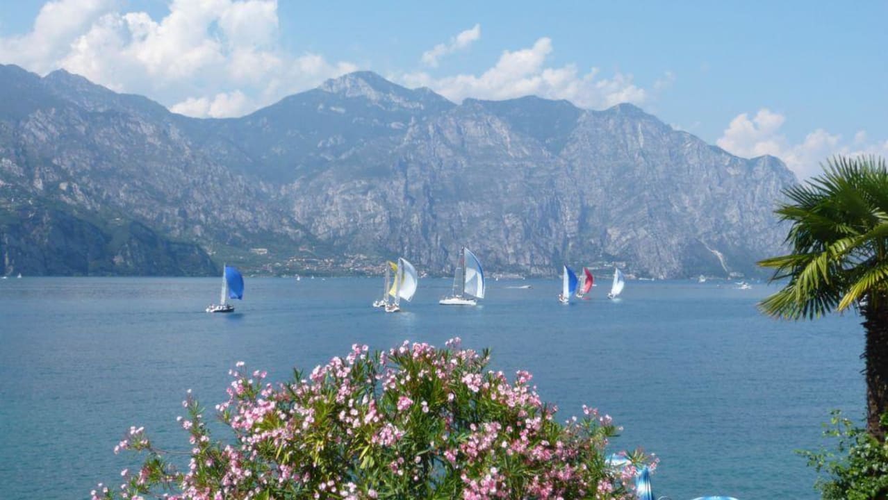 Gegenüber der Ort Limone und die Dolomiten, davor der Gardasee