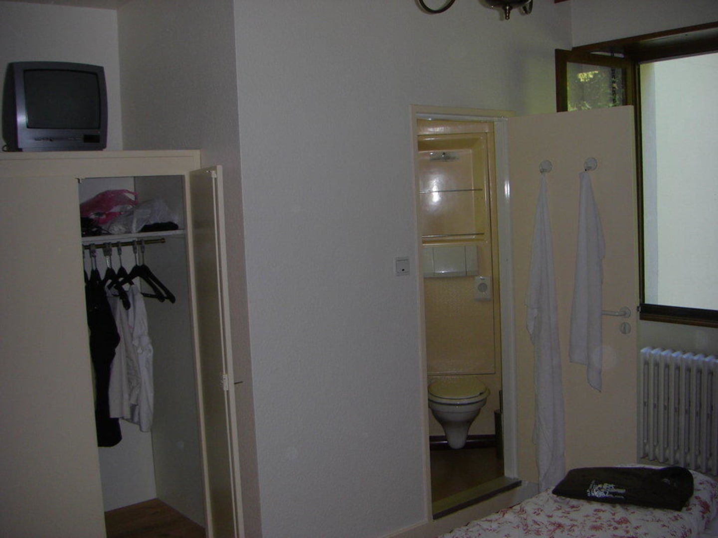 Blick auf die BadezimmertürBlick vom Schreibtisch Richtung Fenster und Badezimmertür. Links im Bild der Einbauschrank mit TV.