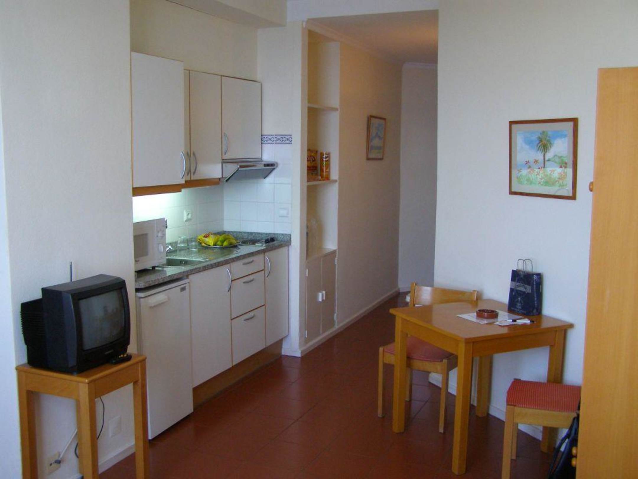 Hier die Küche in Studio 1101 mit Blick zum Eingangsbereich