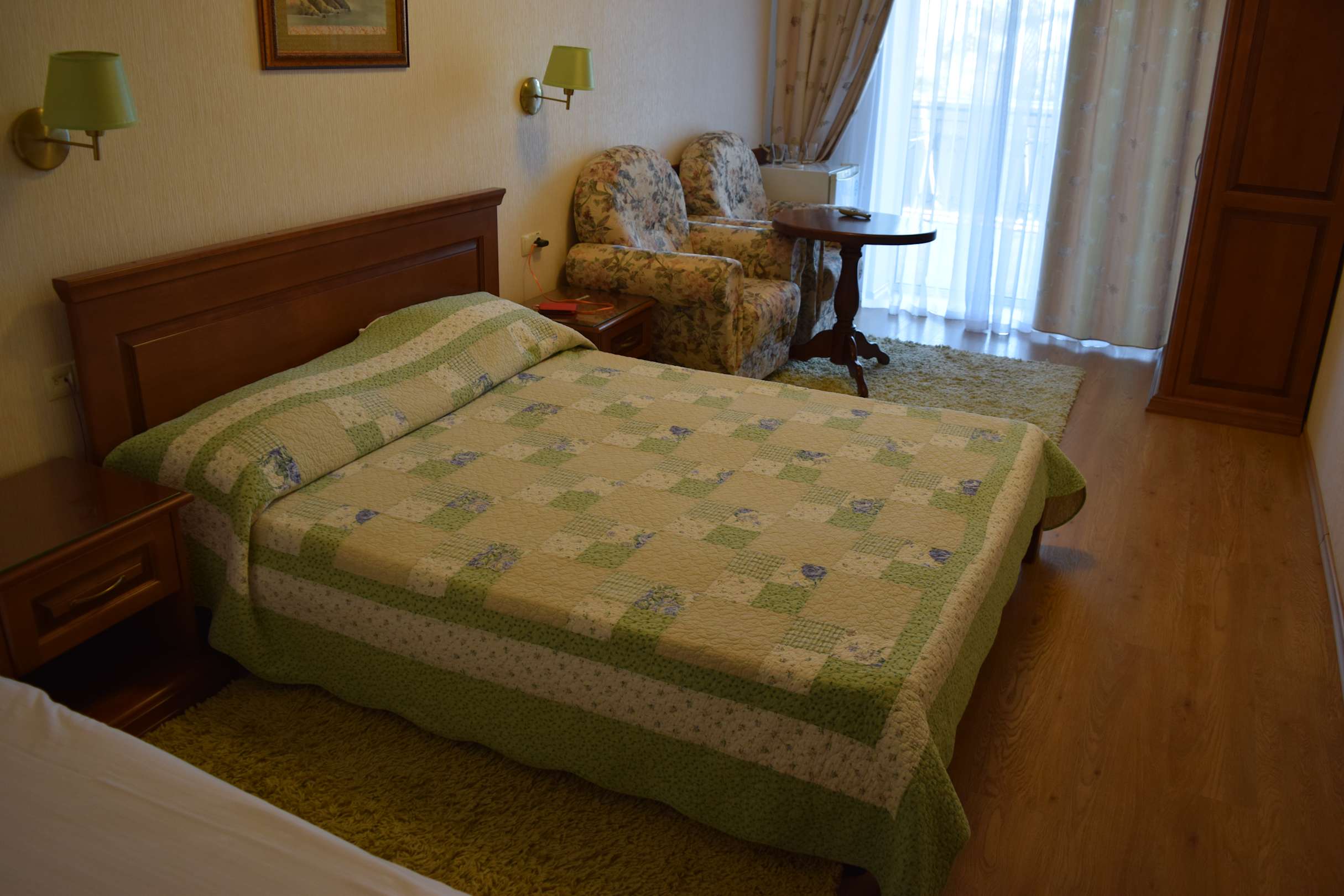 Zimmer mit Doppelbett und Balkon
