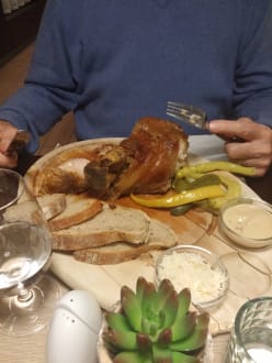 GastroHaxe nicht kross, innen lauwarm, Knochen schwer auszulösen, in der Mikrowelle erwärmt, absolut geschmacklos