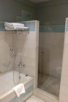 Das Bad mit begehbarer Dusche und separater Wanne