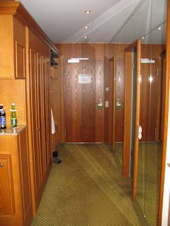 Blick zur Türe, links Schrank und rechts Bad und Toilette