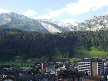 Blick auf EngelbergDas Bild wurde aus einem Hotelzimmer aufgenommen und zeigt den Blick auf Engelberg, die Berge und die Skisprungschanze