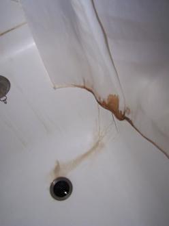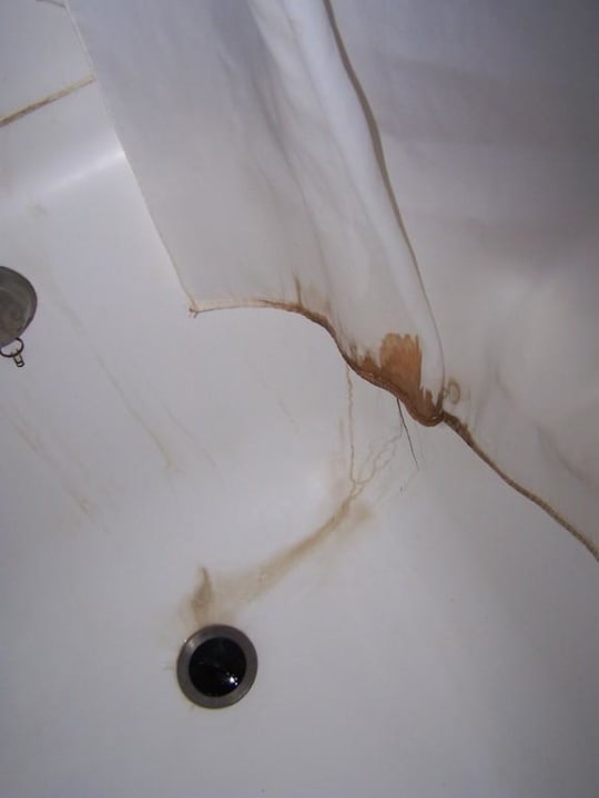 Nur mit Badeschuhe zu betretender Schmutz aus dem Vorhang hat sich schon in die Keramik eingefressen. Riecht so wie es aussieht.