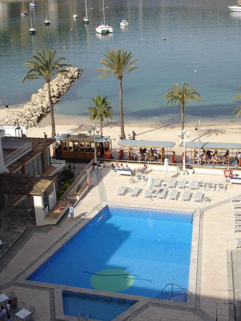 Blick von unserem Balkon zum Pool, auf der Strandpromenade fährt gerade die historische Tram vorbei